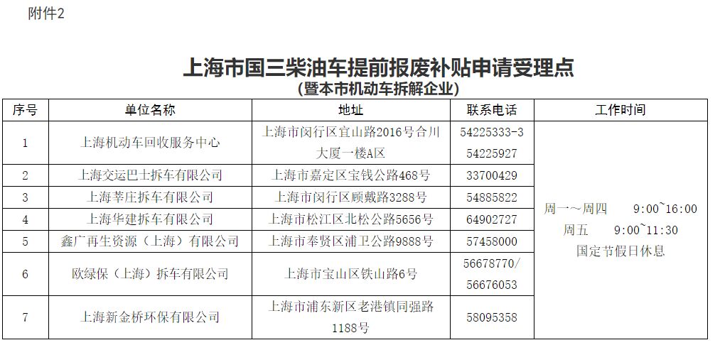 市生態(tài)環(huán)境局會(huì)同市商務(wù)委、市公安局、市財(cái)政局、市交通委指導(dǎo)第三方機(jī)構(gòu)在本市各機(jī)動(dòng)車拆解企業(yè)所在地設(shè)立“上海市國(guó)三柴油車提前報(bào)廢補(bǔ)貼申請(qǐng)受理點(diǎn)(暨本市機(jī)動(dòng)車拆解企業(yè))”(附件2)開(kāi)展相關(guān)工作。