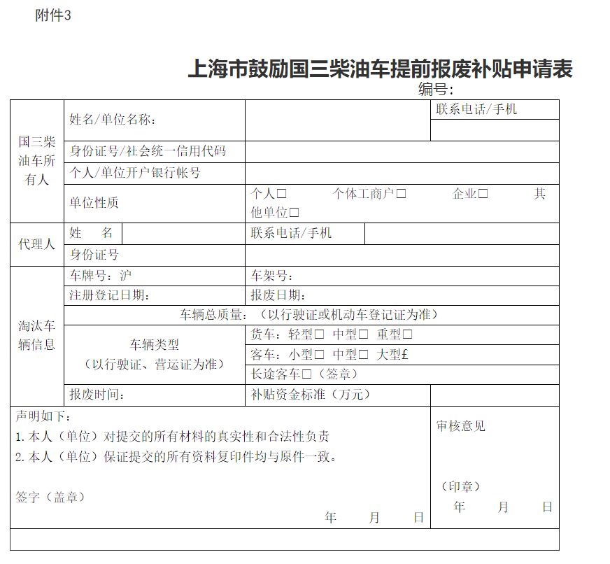 符合本辦法補(bǔ)貼范圍,需申請(qǐng)國三柴油車提前報(bào)廢補(bǔ)貼的,車主應(yīng)先將車輛交由本市機(jī)動(dòng)車拆解企業(yè)辦理報(bào)廢手續(xù),取得《報(bào)廢機(jī)動(dòng)車回收證明》和《上海市機(jī)動(dòng)車注銷證明》后,向指定受理點(diǎn)提交《上海市鼓勵(lì)國三柴油車提前報(bào)廢補(bǔ)貼申請(qǐng)表》(附件3)及其他申請(qǐng)材料。